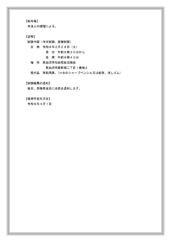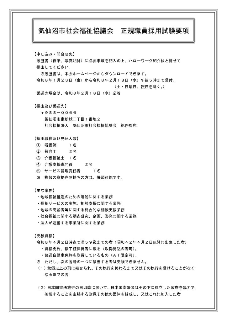 新着情報 正職員募集のお知らせ 2026/1/23 要項・履歴書のダウンロードはこちらからお願いします。 【要項】気仙沼市社会福祉協議会正規職員採用選考について(R8.2実施) 履歴書・様式1(R7年度採用試験向け)2回目 前のページに戻る 高齢者の福祉 障がい者の福祉 子どもの福祉 ボランティア 地域の福祉 相談・貸付・支援 まもりーぶ 社協だより | 個人情報の取り扱いについて | 公式LINE運用方針 |